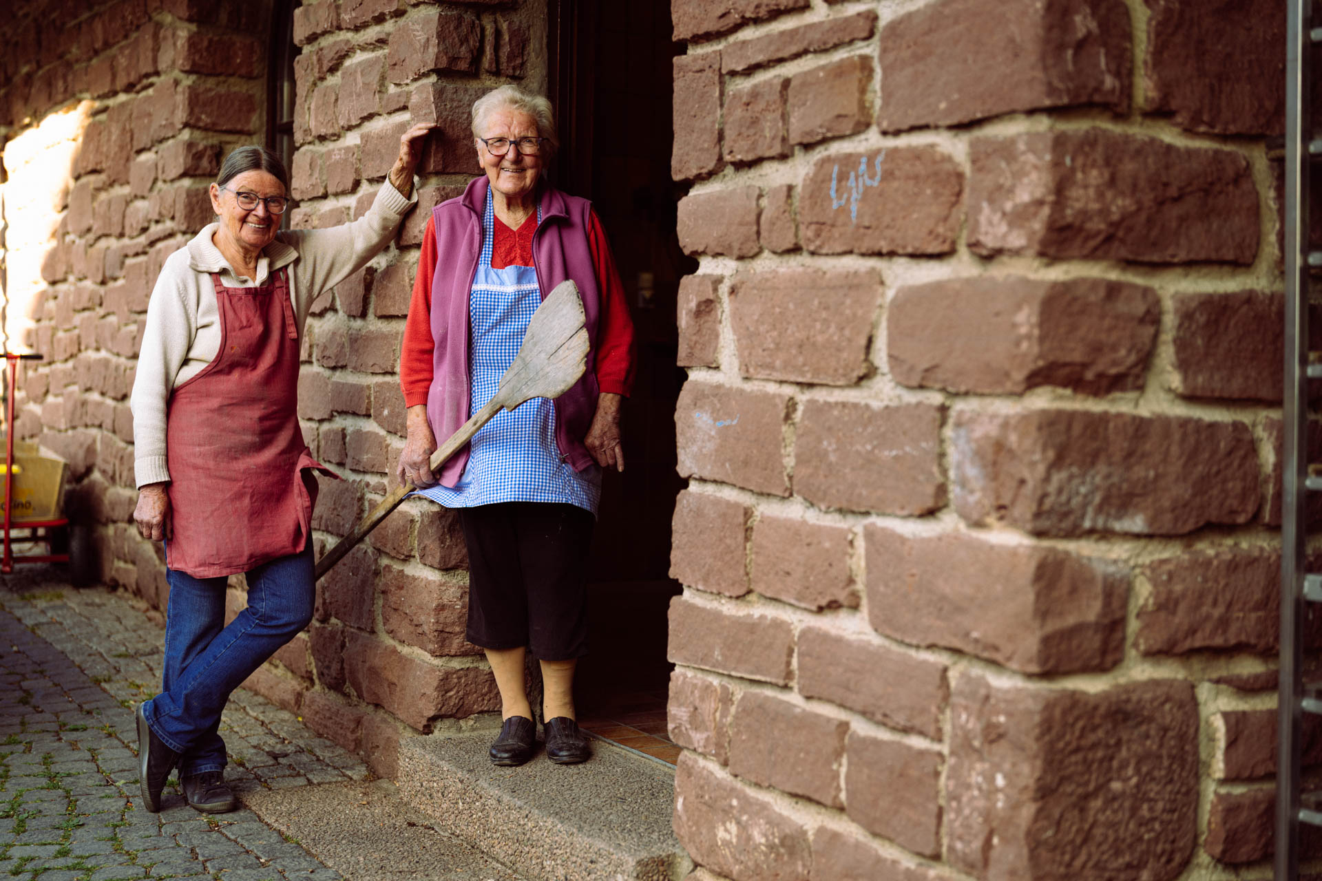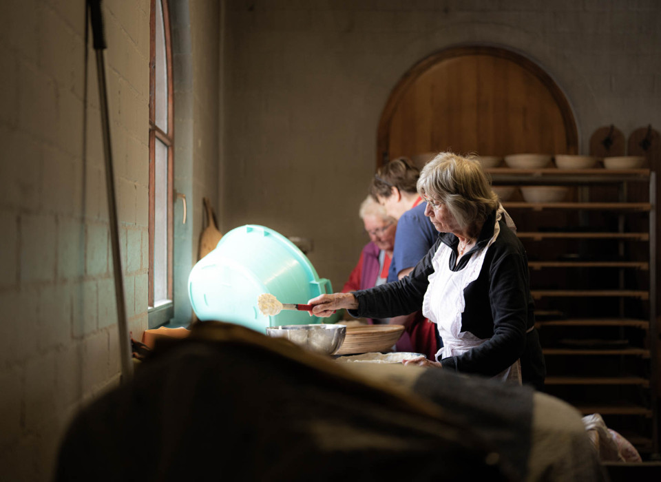 Im Mittelpunkt: der große Ofen aus Schamottstein. Er schluckt bis zu vierzig Laibe Brot oder etwa fünfzehn Kuchenbleche – vorausgesetzt, man weiß, wie man’s einteilt. Elfriede und Elsi wissen das. „Früher war das selbstverständlich“, erzählt Elfriede. „Da kamen die Dorfbewohner alle 14 Tage von überall aus dem Ort und backten ihre Brote: Bauern, Hausfrauen – die hatten Holz, Zeit, Routine.“ Wenn ihnen das Brot ausging, ging es von vorne los. Heute ist das anders. „Die Frauen arbeiten, der Alltag ist voller geworden, und außerdem kann man Brot auch überall kaufen.“ Elfriede selbst war Erzieherin in einem Waldkindergarten, bevor sie vor sieben Jahren in den Ruhestand ging. Als sie mit ihrer Familie wieder zurück in den Ort zog, fand sie im Elternhaus die alten Backutensilien der bereits verstorbenen Mutter. „Etwas flammte dabei in mir auf.“ Und das Backhaus stand still. Wo früher täglich gebacken wurde, vergingen plötzlich Wochen ohne einen Funken im Ofen. „Ich dachte: Das kann doch nicht sein!“, erzählt sie. „Also habe ich angefangen, mich zu kümmern. Ich wollte, dass das hier wieder ein Ort wird, wo Leute zusammenkommen. Wo Tradition nicht nur angeschaut, sondern gelebt wird.“