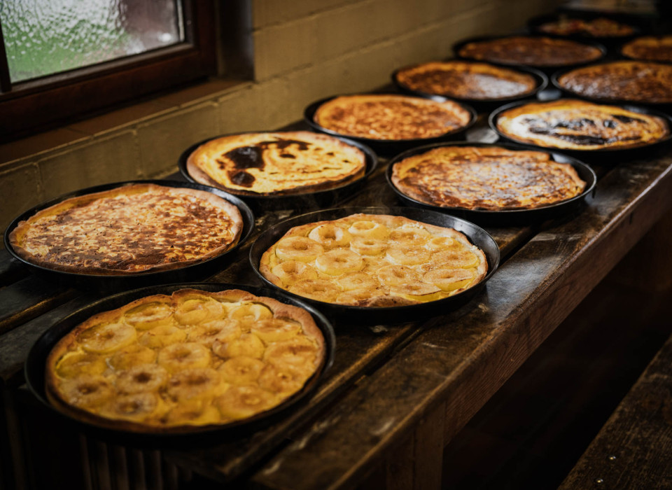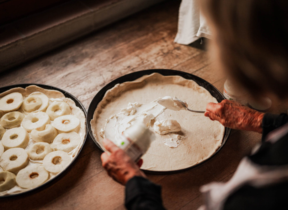 Während Elsi noch einmal den Ofen überprüft, füllt sich der Wagen mit den fertigen Kuchen. Jeder von ihnen ist ein Unikat: Mal sind die Apfelschnitze akkurat drapiert, mal wilder verteilt. Beim Zwiebelkuchen dominiert entweder