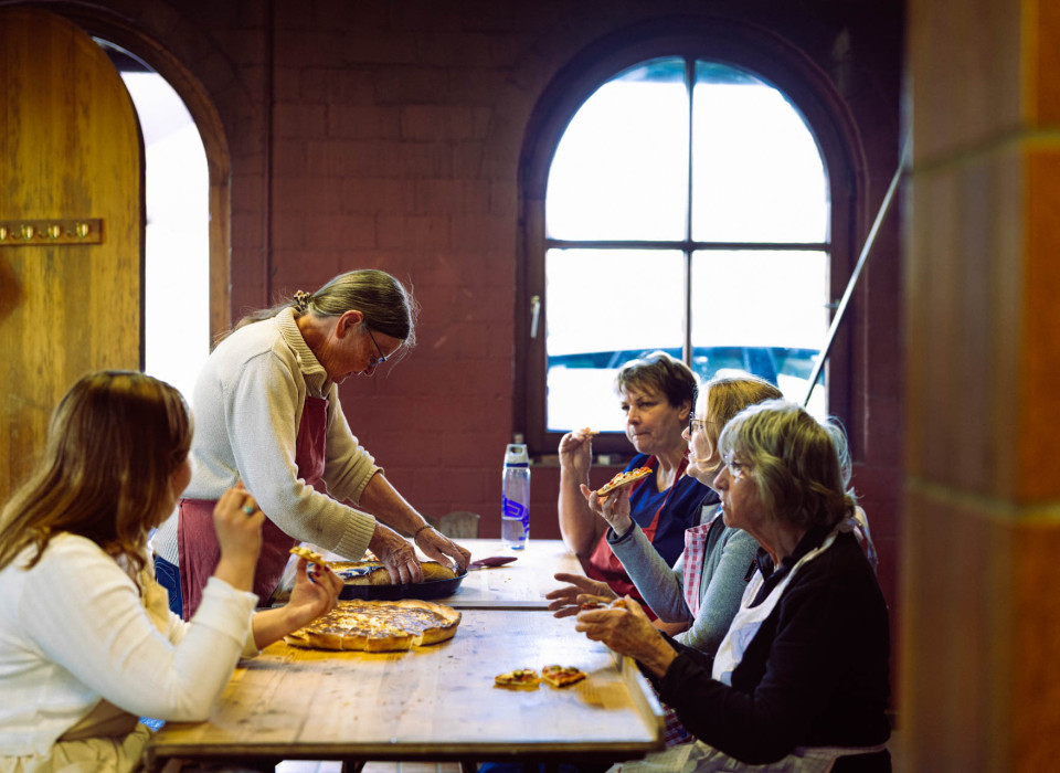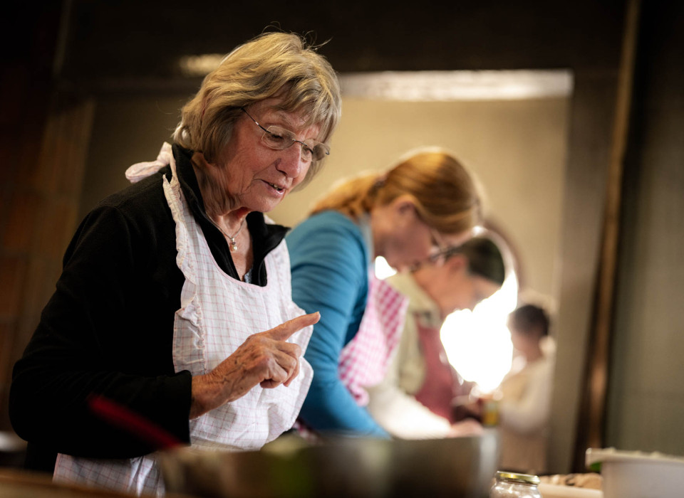 Unsere beiden Kursleiterinnen schneiden die ersten fertigen Kuchen an. Es wird probiert und gequatscht. Alle sind hungrig von der Arbeit – aber auch glücklich und stolz. Elfriede erzählt von früher, von ihrer Mutter, deren altes Backzubehör sie bis heute benutzt. Es war mehr als nur nostalgisches Erbstück: Es brachte sie mit auf die Idee. „Ich war schon immer ein bisschen alternativ“, sagt sie und lacht. „Holz im Wald sammeln, den Acker bepflanzen, ein Ofen mit Holzfeuer – das war einfach mein Ding.“ Und auch beim Backen blieb sie ihrer Linie treu: nachhaltig, einfach, handgemacht. Auch die 90-jährige Elsi hat hat ihre eigene Geschichte. Als junges Mädchen musste sie Mama daheim beim Backen helfen. „Man hat’s halt gemacht“, sagt sie. Irgendwann drehte sich ihr ganzes Leben nur noch ums Backen. Als sie für die Kurverwaltung in Bad Liebenzell gebacken hat, kamen ganze Busladungen von Kurgästen, die ihr beim Zubereiten zusahen. Heute teilt sie ihr Wissen im kleineren Kreis. Ganz aufgeben möchte sie es aber nicht, zumindest noch nicht.