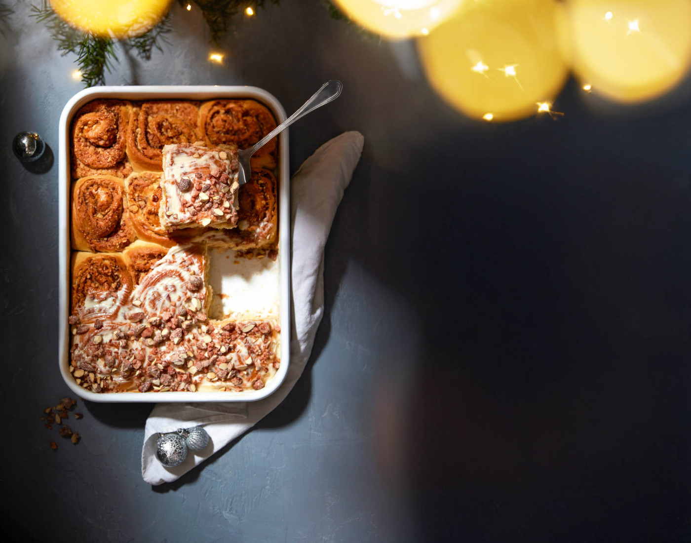 Die Form auf den mittleren Einschub in den kalten Ofen stellen, die Aufheizzeit nutzt der Teig nochmals zum Aufgehen. Die Schnecken bei 170 Grad für etwa 30–35 Minuten backen. Aus dem Ofen nehmen und kurz abkühlen lassen. Frischkäse mit Zitronensaft, Puderzucker und Zimt zu einem cremigen Frosting verrühren. Auf den noch warmen Schnecken verteilen und die zur Seite gestellten Mandeln darüberstreuen.