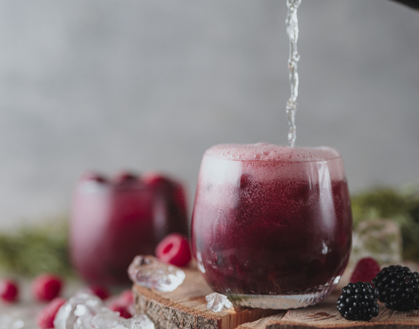 Eine Handvoll rote Beeren (frische Himbeeren, Heidelbeeren, Brombeeren, Johannisbeeren oder eine Tiefkühlmischung) zusammen mit dem Cranberrysaft im Mörser zerdrücken.
