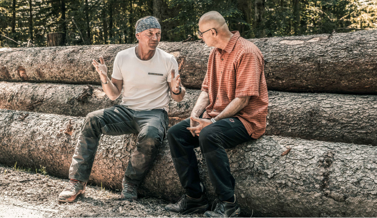 Mit der Königin des Waldes wollen wir bei Ralph bauen lernen, oder wie es der Kursleiter ausdrückt: „Stamm um Stamm ziehst du dein Projekt nach oben.“ Tatsächlich kann er ein Portfolio äußerst schicker Blockhäuser präsentieren, die Teilnehmer seiner Kurse schon „nach oben gezogen haben“. Oder man lässt sich einfach von Ralph eines bauen. Er hilft dann bei der Planung und schreibt die Holzliste für den Förster, damit dieser weiß, welche Durchmesser und Längen benötigt werden. Das eingeschlagene Holz wird zum Sägeplatz transportiert und sofort entrindet. Das passiert mit Wasserdruck von 350 bar und ist harte Arbeit. Gut für den, der nicht selbst baut, sondern bestellt hat …