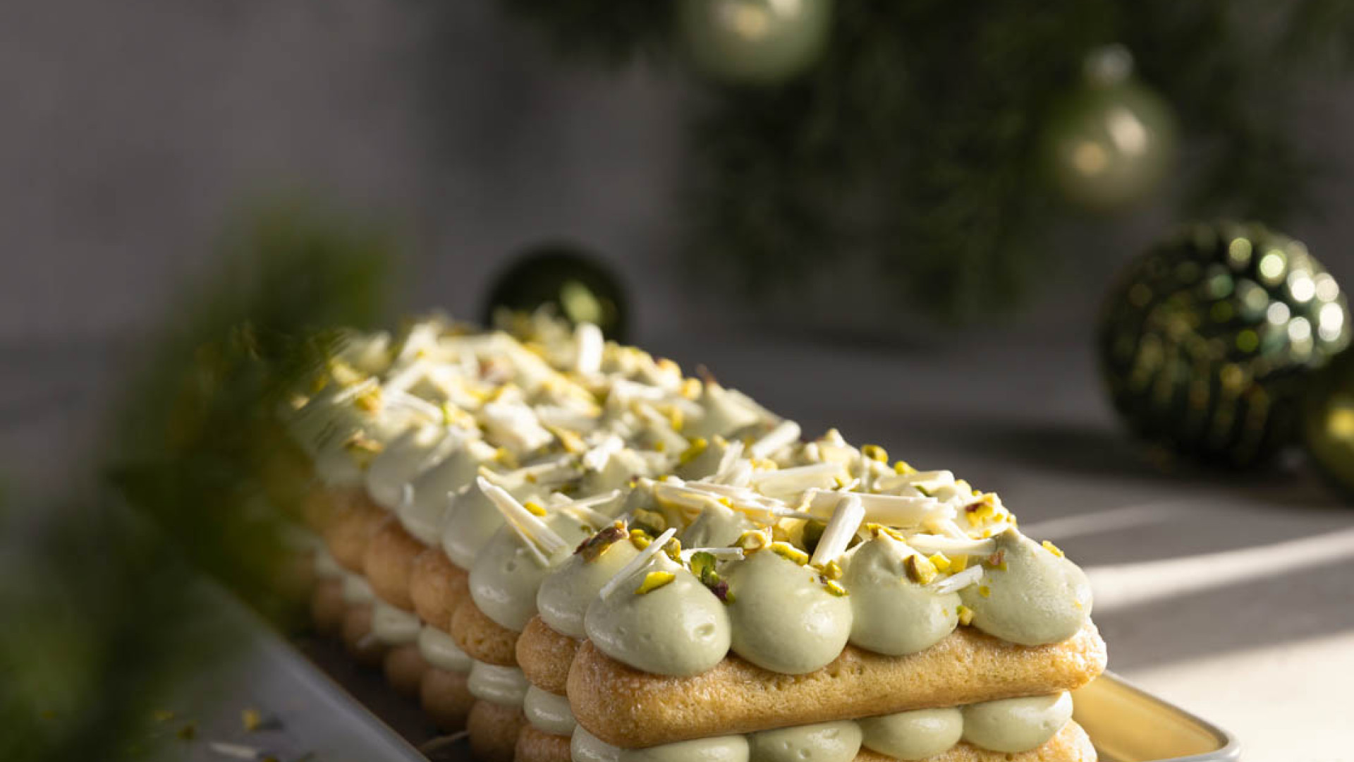Die Hälfte der Löffelbiskuits in die Pistazienmilch tauchen und nebeneinander auf eine rechteckige Servierplatte setzen. Je Löffelbiskuit 4 gleichmäßige Tupfen der Pistaziencreme darauf spritzen. Nun die andere Hälfte der Löffelbiskuits in die Pistazienmilch tauchen und auf die Pistaziencreme-Tupfen legen. Wieder je Löffelbiskuit 4 gleichmäßige Tupfen der Pistaziencreme aufspritzen. Das Dessert für mindestens 2 Stunden in den Kühlschrank stellen.