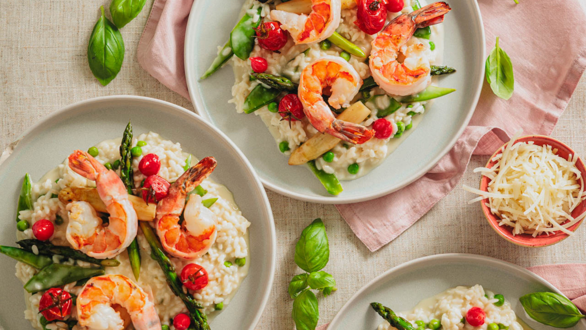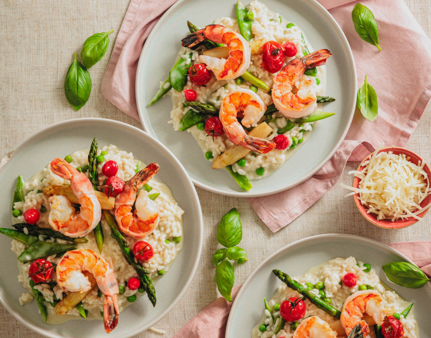 Restliche Butter, Parmesan und Zitronenschale ins Risotto rühren, 5 Minuten ruhen lassen. Gemüse unterheben, abschmecken und in tiefen Tellern anrichten. Nach Wunsch mit gebratenen Gambas servieren.